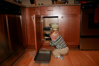 New Pictures: bib-capes, organizing the cupboards, 10-month picture, and first snow.